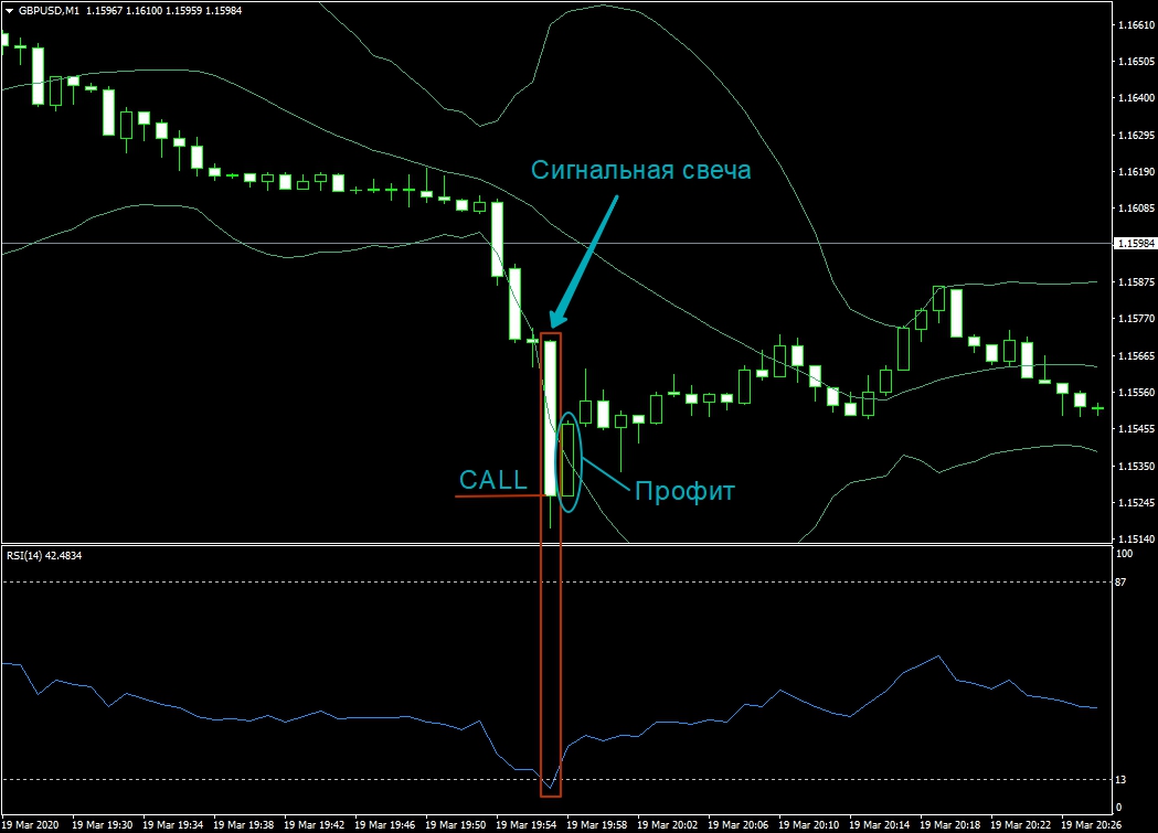 Если свеча закрывается за нижней границей индикатора ВВ или на ней, и мы имеем подтверждение от индикатора RSI, то есть, он находится ниже уровня 13, мы покупаем CALL с периодом действия в 60 секунд.