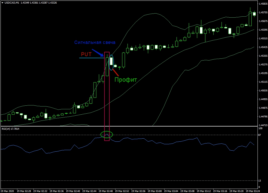 Если свеча закрывается за верхней границей индикатора ВВ или на ней, и мы имеем подтверждение от индикатора RSI, то есть, он находится выше уровня 87, к покупке рекомендуется опцион PUT со сроком в 60 секунд.