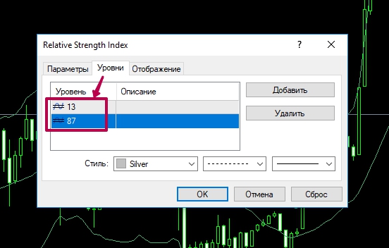 Но для более консервативной торговли, мы применяем следующие настройки — уровни 13 и 87.