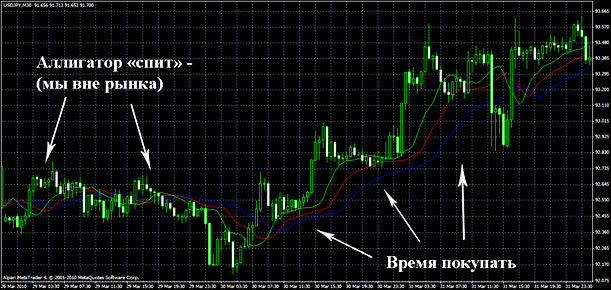 Эта стратегия дает возможность не только определять отсутствие либо наличие рыночного тренда, но и его тенденцию. Индикатор «Аллигатор» имеет два основных положения – раскрывающий пасть и спящий. Именно когда у «Аллигатора» пасть открыта – появляется рыночный тренд.