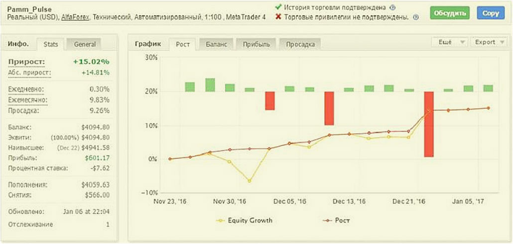 Среднемесячный прирост находится примерно на уровне 9.8% по одному мониторингу, сделки по большей части являются плюсовыми, а просадка не превышает десяти процентов. Темп торговли, можно охарактеризовать как достаточно спокойный. На другом мониторинге, результаты поскромнее – 4% месячный прирост и долгое топтание около нулевой отметки.