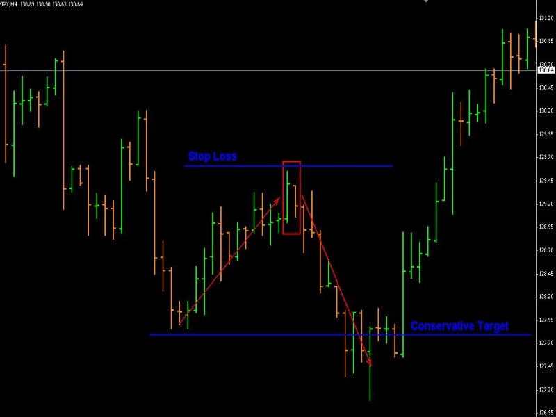 Продажу осуществляют, т.е. открывают короткую позицию, когда внутренний медвежий бар (с закрытием вниз) следует за контейнерным бычьим баром при четко различимом восходящем тренде.