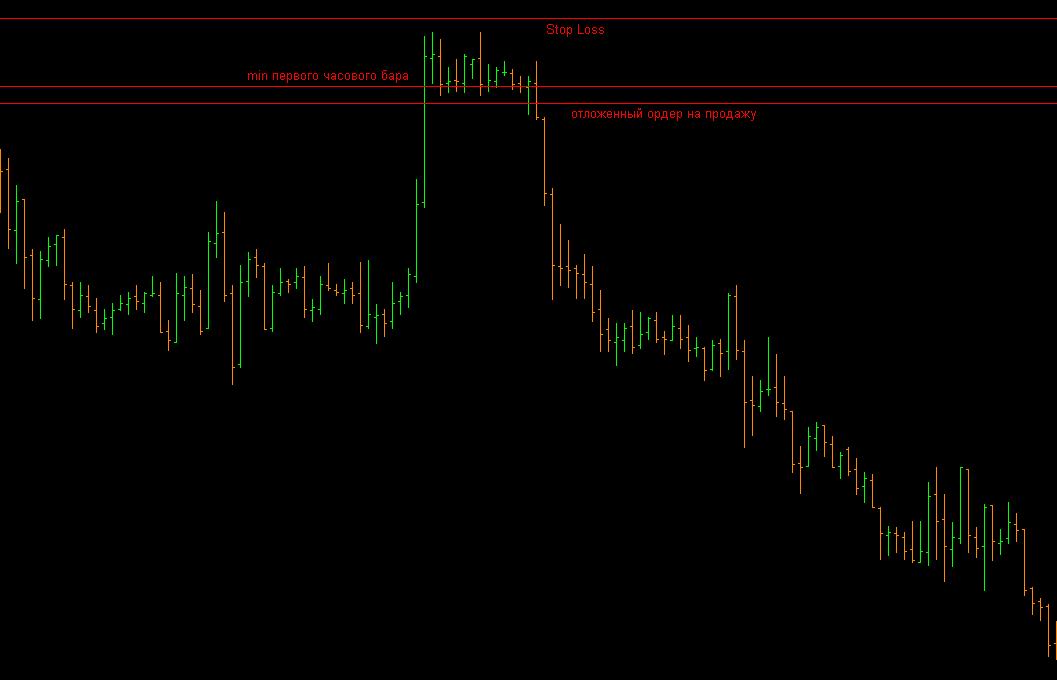 После того, как будет получен такой сигнал на дневном графике, рекомендовано для анализа 1-го часового бара переключится в часовой таймфрейм. Сразу после закрытия бара следует выставить на продажу отложенный ордер на 20-ть пунктов ниже от барного минимума, допустимо также 15-10 пунктов.