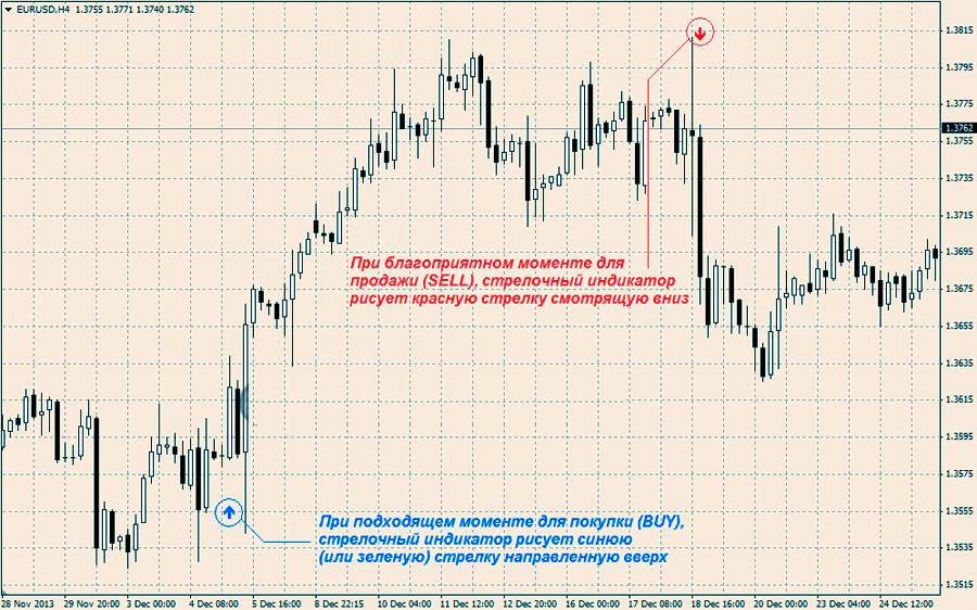 Прежде всего, пересечение линий у осциллятора. Важно понимать выше он или уже ниже общего, центрального уровня. Да и вообще присутствует ли дивергенция?!Что касается стрелочных индикаторов тут все просто. При появлении нужного момента покупки, наш индикатор начинает рисовать под текущей свечкой стрелку наверх. При возникновении момента, выгодно продать валюту наш индикатор изображает на графике над баром стрелку, опущенную вниз.