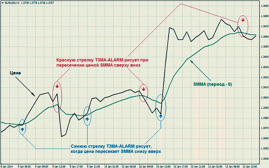 Трендовый индикатор «ТЗМА -ALARM» является простым стрелочным инструментом, который основан на советнике сглаженном скользящем средней. Как правило, визуально на графиках данный индикатор представлен в виде небольших стрелочек, которые указывают преимущественно на направленность тренда, а также открытие позиций.