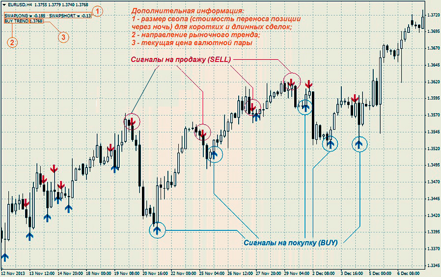 Сложно поспорить, что это весьма наглядно. При появлении синей стрелки можно говорить о купле, а красной о продаже валюты. При использовании советника, отпадает необходимость тратить личное время для анализа рынка. Этот индикатор основан на весьма простом принципе.