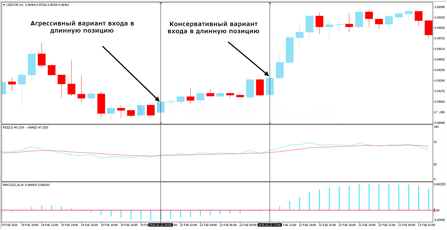 Здесь существуют два способа – агрессивный и консервативный. В агрессивном случае, наблюдается пересечение синей линией красной от низа кверху (эта информация представлена в окошке под ценовым графиком). Во втором случае, скользящая средняя пересекается RSI снизу вверх, причем в это время показатель осциллятора MACD должен возвышаться над нулевой отметкой.