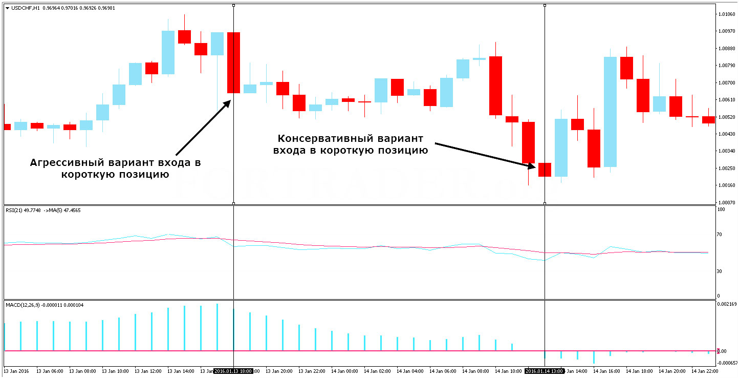 Здесь ситуация несколько иная: консервативный способ подразумевает пересечение скользящей RSI от верха книзу и показатель MACD под нулевой отметкой; агрессивный вход в короткие позиции становится уместным при простом пересечении RSI скользящей средней от верха к низу. Уровень стоп-лосса выставляется сверху ближайшего локального максимума.
