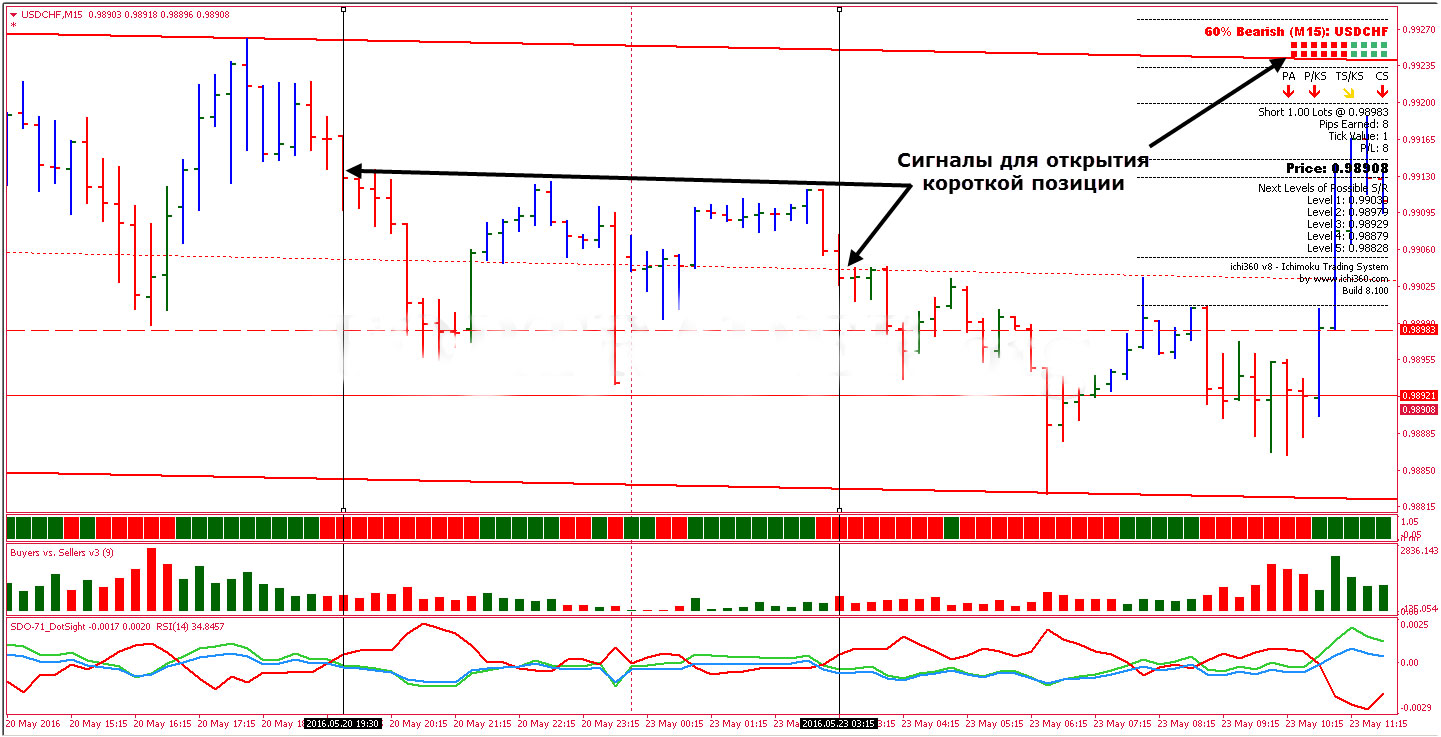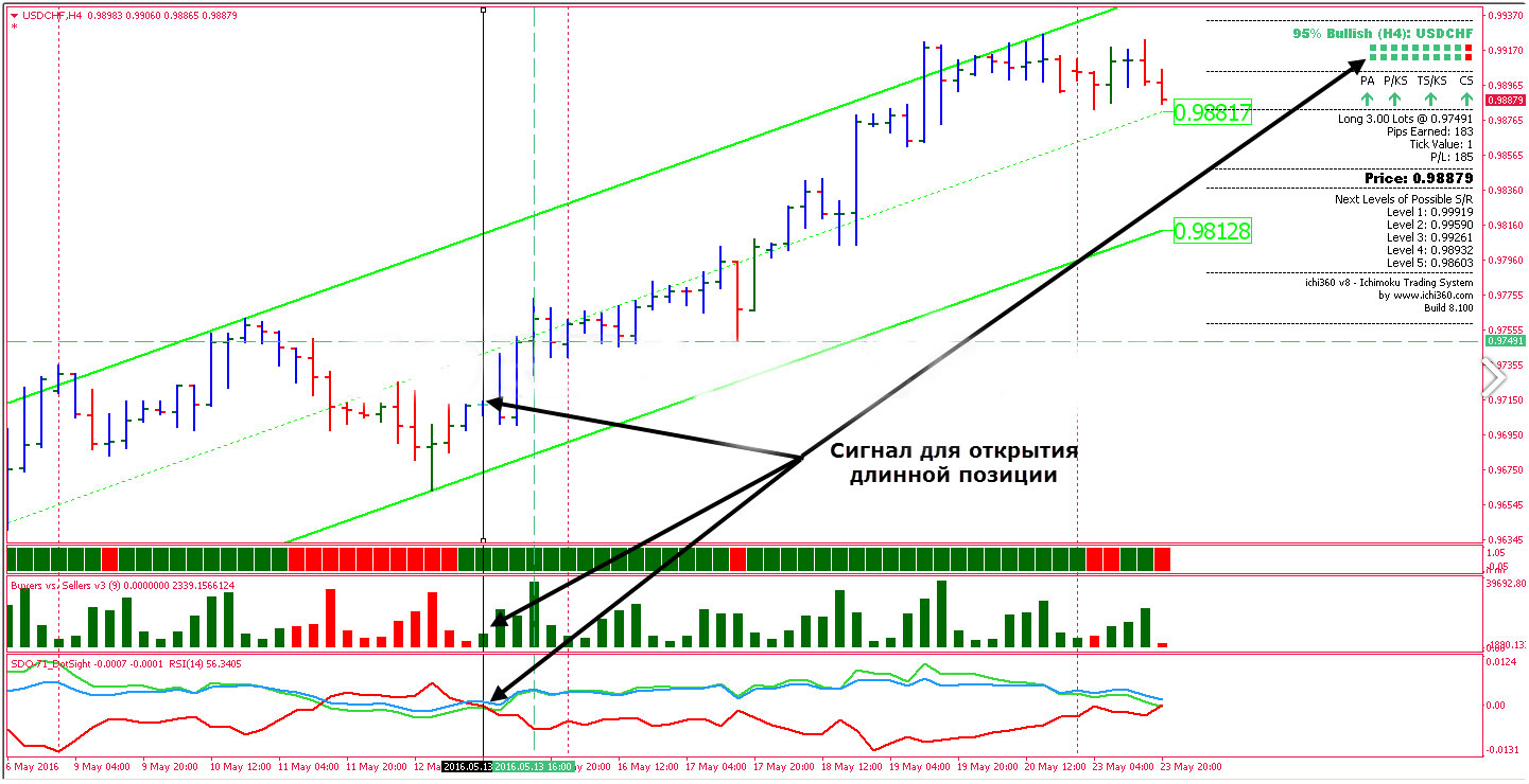 направленный вверх, слегка наклонный канал, данные ichi360 о восходящем тренде, сформировавшийся зеленый столбец на панели Buyers / Sellers и линия (красного цвета) SDO-71_DotSight, которая пробивает красную снизу. Как это выглядит на практике, вы можете посмотреть на скриншоте.