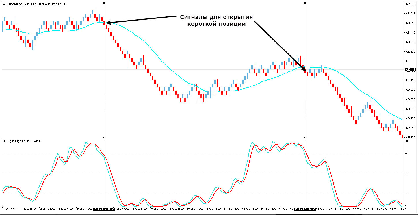 Для успешной продажи, следует соблюдать следующие условия: свеча закрывается ниже скользящей средней, Стохастик только начал покидать сектор перекупленности.
