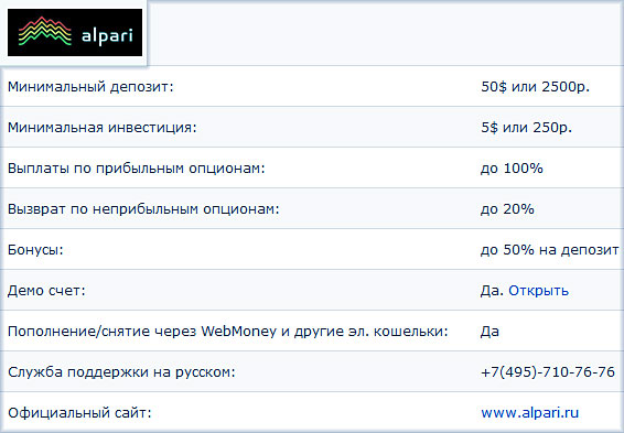 У брокера Алпари отличные условия для опционного трейдинга. Депозит и лот минимальные, есть 4 вида типа контрактов с высокой прибыльностью. За вывод и ввод взимаются небольшие комиссии.