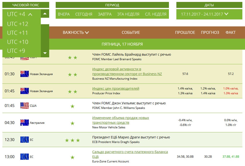 Календарь экономических событий от ФрешФорекс, можно настроить по степени их важности, а также отдельно выбрать государство, с которым непосредственно связана важная новость. Перед тем как работать с данным календарем, следует настроить часовой пояс таким образом, чтобы он совпадал со временем вашего торгового терминала.