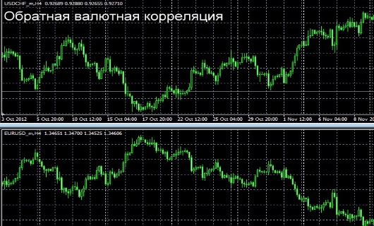 Отрицательная (обратная) валютная корреляция предполагает ценовое изменение двух валют в противоположных направлениях, т.е. цена одной валюты поднимается, а другой, наоборот падает.