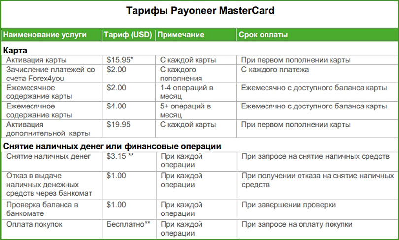 Комиссии на вывод, у большинства работающих с данной картой брокеров небольшие и фиксированные (около 2-3$), но само обслуживание карты потребует некоторых вложений – на саму активацию, на оплату ежемесячного пользования и на некоторые финансовые операции, скажем, проверка баланса по счету в банкомате.