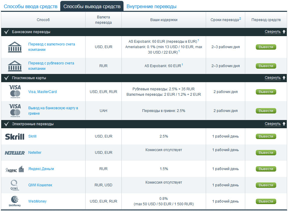 Для примера, покажем Вам возможные способы вывода у брокера Альпари.