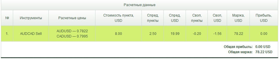 Как видите, калькулятор трейдера в виде табличных данных сделал расчет по каждой из пары валют и указал: