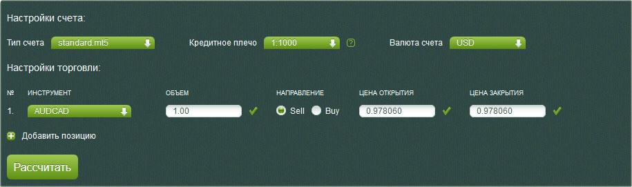 Далее, чтобы калькулятор трейдера произвел расчет, после ввода всех данных необходимо активировать кнопки «Добавить позицию» и «Рассчитать».