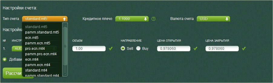 Итак, калькулятор трейдера от Альпари содержит 9 типов счетов:
