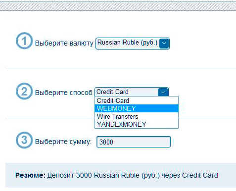 В случаях выбора пополнения депозита валютами EUR либо USD добавятся способы Скрилл и Монета. Минимальный депозит в компании равен 200 $ США. Также следует сказать, что для совершения сделок брокер установил минимальную сумму в 10USD и максимальную – 500 USD. При этом если трейдеры имеют возможность и намерены в опционы вложить значительные средства, то совершать сделки можно в неограниченном количестве.