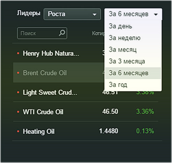 Выбирается актив через фильтр «лидеры роста и падения». По нему видна информация в процентах.