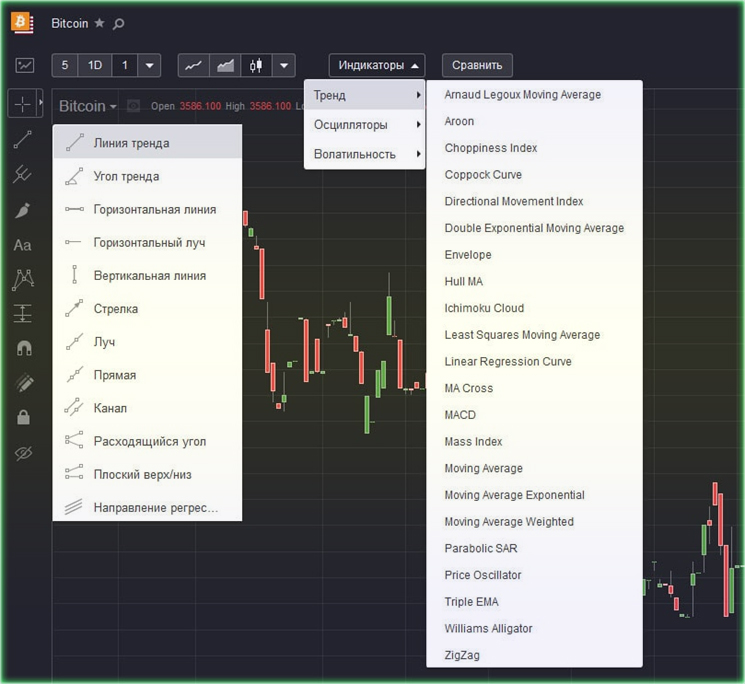 - отбирает индикаторы и формат отображения актива – линией, в виде японских свечей или зоны;