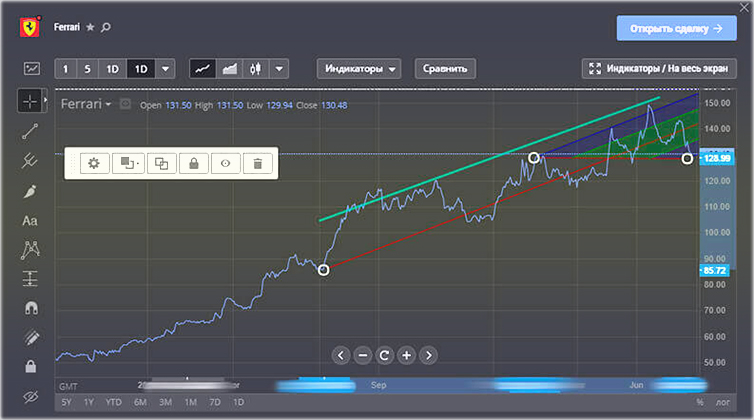 - горизонтальные, также вертикальные и линии трендовые для рисования; каналы регрессии используются для прогноза по будущим значениям, например, чтобы выявлять заниженность или завышенность курса;