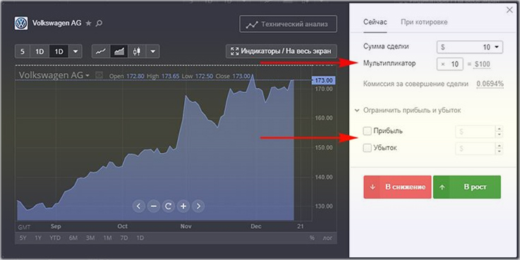 4. Внимание! Не забываем ограничить прибыль и убытки. Для этого выбирается «В снижение» или «В рост» – все зависит от персонального прогноза.