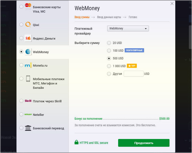 Сделка открыта в реальном времени, и сразу начисляется комиссия. Инвестор сам устанавливает стоп-приказ брокеру, когда покупать/продавать. Присутствует и кредитное плечо, его максимальный размер – 500, то есть уровень 1:100. При таком раскладе риск потери инвестиционных вложений уменьшается. Достаточно внести на депозит минимально 10 USD. Чтобы увеличить сумму первоначальных вложений, допускается открытие заявки (приказа брокеру) по выбранному активу.