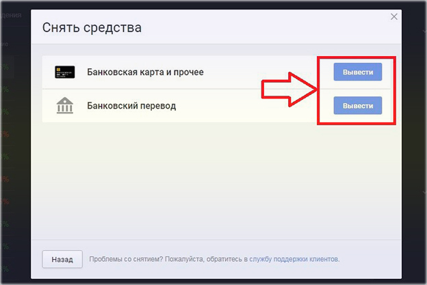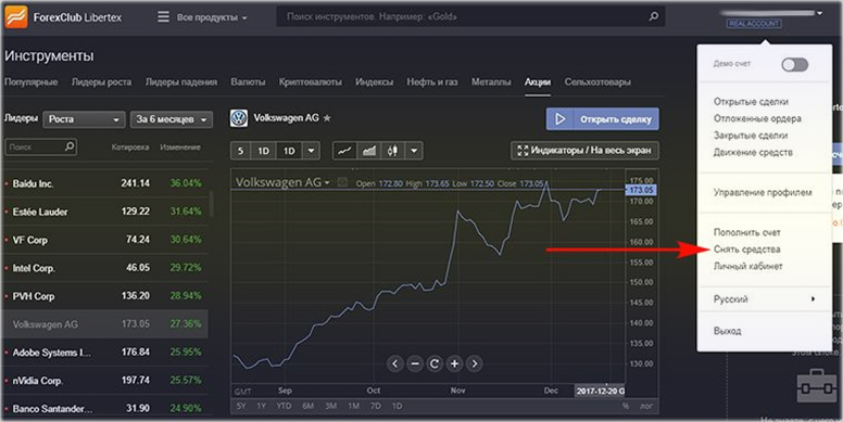 Снять деньги с депозита можно из самой платформы. Вверху, рядом с именем аккаунта, выбирается выпадающее меню с разделом «Снятие средств».