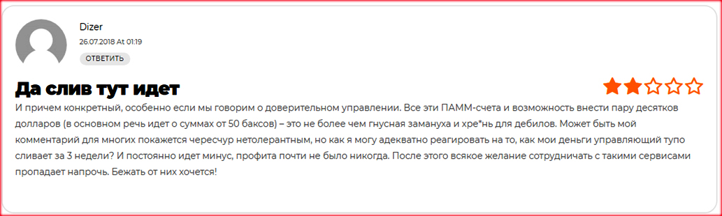 По этой причине компания так активно продвигает услугу ПАММ-счета, с которой никому не следует иметь дело, чтобы не потерять деньги.