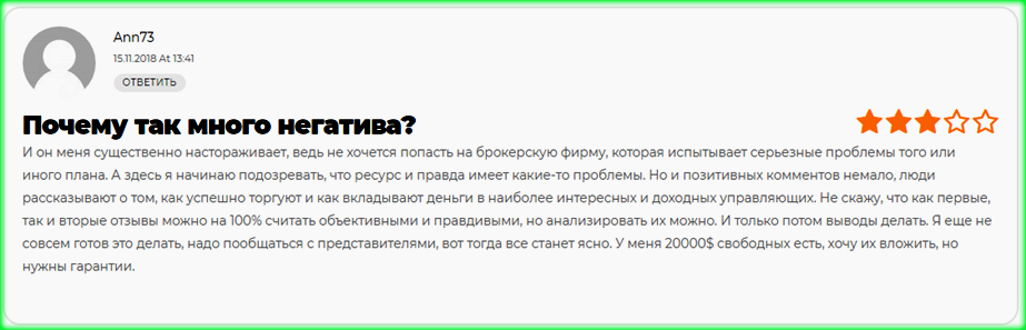 Но если имеются лишние 20 тысяч долларов, то почему бы не попытать счастья, отдав деньги управляющему, который обещает с помощью этого брокера через месяц удвоить их? Каждому нужно определить для себя: стоит ли вкладывать деньги в торговлю на Форекс под эгидой в этой компании или нет. Только испытав на собственной шкуре ситуацию, можно будет понять: на самом ли деле брокер так плох или же это честный управляющий, где получится заработать деньги.