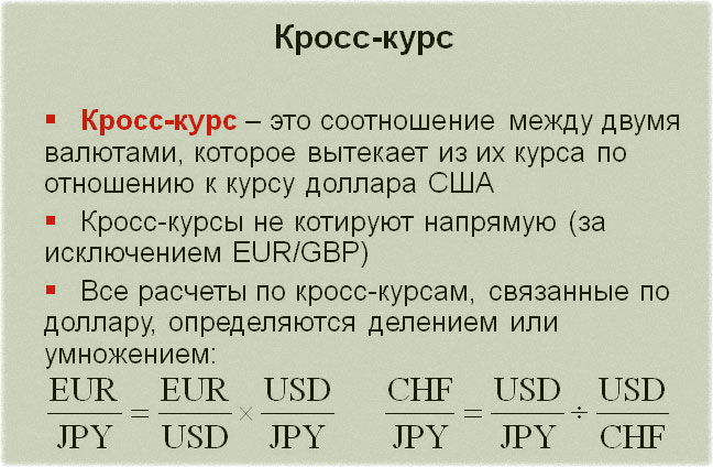 Кросс-курсы обладают меньшей волатильностью, чем экзотические пары. Кросс-курсы представляют собой соотношение курсов валют по отношению к котировкам американской национальной валюты. Их нельзя котировать напрямую, кроме пары EUR–GBP.