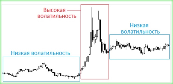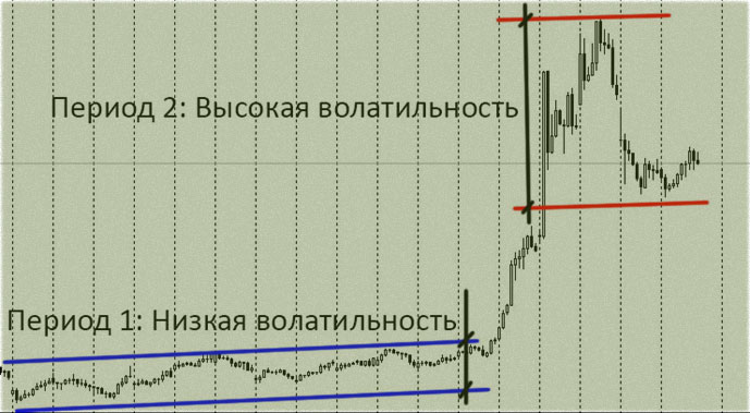 Но есть и обратная ситуация, когда цена колеблется быстро, резко и в широком диапазоне. В такие моменты на графике наблюдается интервал, именуемый зоной высокой волатильности, который обычно происходит, когда публикуются важные новости экономики.