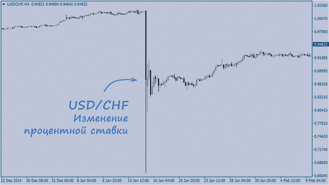 Вот, например, что случилось с графиком пары USD/CHF, стоило только швейцарскому банку немного изменить процентную ставку. И так может случиться абсолютно с любым торгуемым активом.