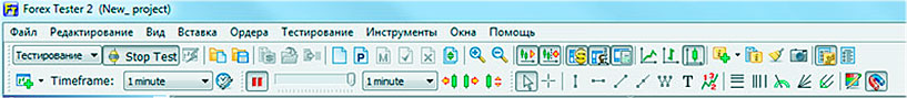 В верхней панели инструментов находятся такие же функции, как в терминале МТ4 – набор индикаторов (можно дополнять собственными и пользовательскими разработками), всевозможные графические инструменты, а также инструменты для управления непосредственно процессом самого тестирования (запуск, остановка, изменение скорости и тому подобное).