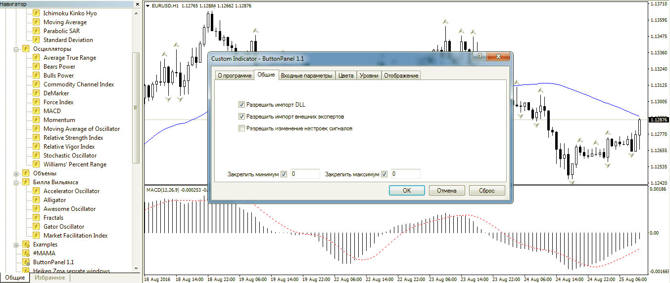 Далее перезапустите торговую платформу – в окне «Навигатор» с левой стороны у вас появится установленный тестер (Button Panel). Помимо этого, доступ к тестеру ручных стратегий осуществляется следующим образом: «Вставка» → «Индикаторы» → «Пользовательский».