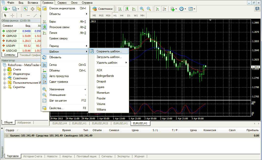 В независимости от выбранного способа, вы заметите, что никаких изменений на графике не произошло – не стоит переживать, это нормально. Далее, прижмите правую кнопку мышки на свободном поле графика и в контекстном меню сделайте действие «Шаблон» и затем «Сохранить шаблон», задав имя tester.tpl.