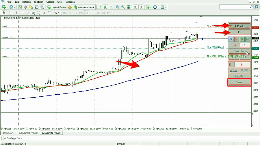 При использовании данного тестера ручных стратегий, вы можете осуществлять управление сделками посредством переключения между ними при помощи специального ID идентификатора. Переключение между ними, производится с помощью стрелок. Если сделку необходимо удалить, то ее необходимо выделить и активировать «Close». (Скриншот ниже).