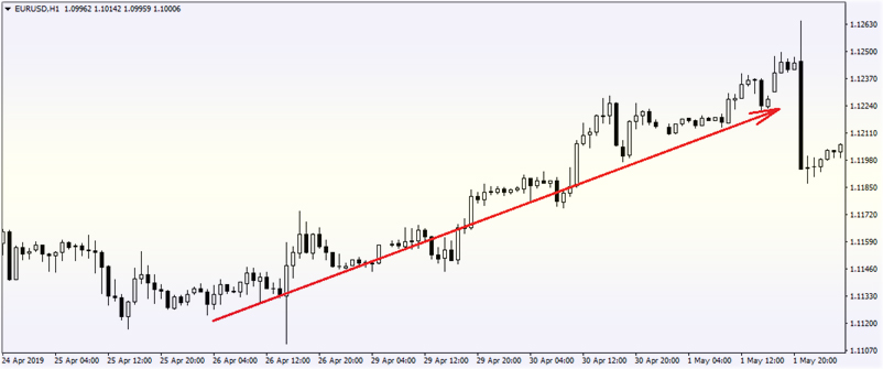 Движение цены (тренд) вверх-вниз в одном из направлений продолжается длительное время. Она не проходит строго по прямой линии. Развитию ценового движения (как движется валютный курс) сопутствует подъем или спад.