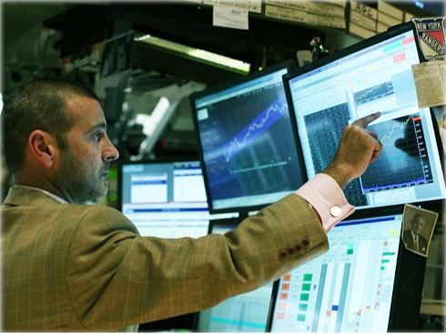 Трейдеры в зале являются профессиональными спекулянтами, представляющими интересы огромного количества клиентов. Трейдеры у мониторов, осуществляют торги посредством специальных мониторов, позволяющих наблюдать за заявками других инвесторов, контролировать собственные, а также строить всевозможные графики и производить математические анализы.