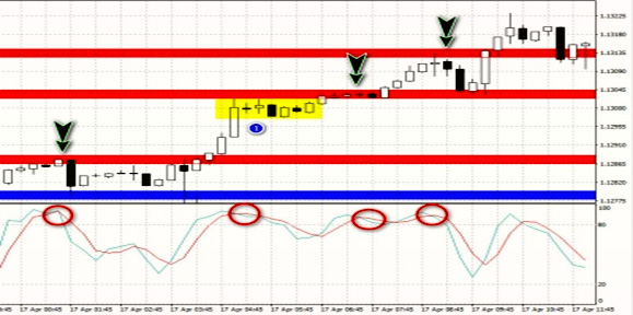 На последней картинке единицей обозначена ситуация, когда сделки быть не может, так как линии Стохастик пересеклись до момента, когда еще не подошли к уровню сопротивления.