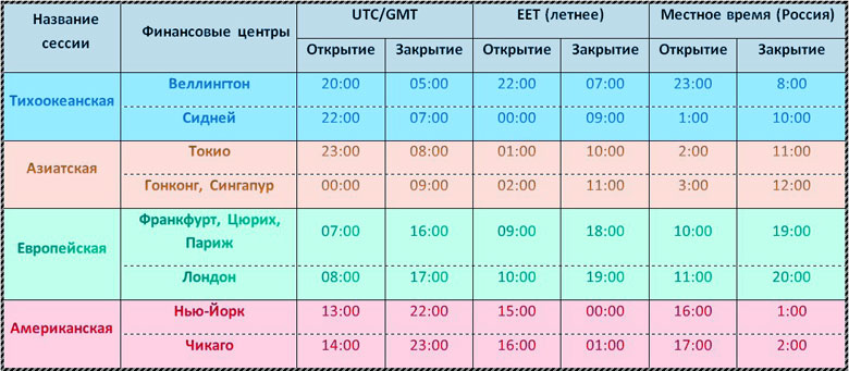 Традиционно, валютный рынок разбит на часы работы 4-х основных торговых сессий: