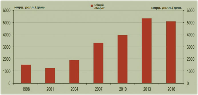 Среди них есть такая структура, как “Банк международных расчетов”, основанный благодаря межгосударственному сотрудничеству Центробанков. Уже почти 30-лет она выкладывает в общедоступные результаты изучения валютного рынка. Их вы можете увидеть на графике ниже.